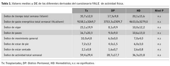 En un estudio participaron 25 enfermos renales crónicos varones de entre 59 y 72 años divididos en 3 grupos: trasplantados renales, hemodializados y en tratamiento de diálisis peritoneal. A los sujetos se les administró el cuestionario de cuantificación de actividad física YALE que permite calcular el tiempo total dedicado a la semana a todas las actividades físicas, el gasto energético semanal en kilocalorías, 5 índices individuales para las dimensiones de actividad y un índice de actividad global (Tabla 1).