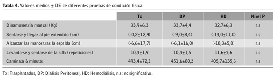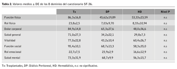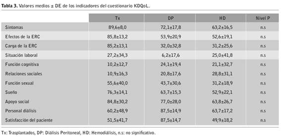 Respecto a la tabla 3 se presentan los resultados medios en los diferentes ítems del cuestionario KDQoL de cada grupo. En él se observa que en los apartados referentes a la enfermedad los Tx puntúan con valores más altos que los sujetos en HD y DP. Sin embargo, en lo referente a las relaciones sociales los sujetos en diálisis son los que obtienen mayor puntuación.